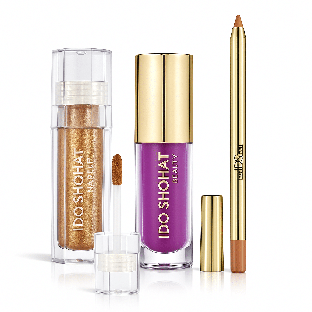 מארז הכולל גלוס, סומק נוזלי ועיפרון שפתיים – שלושה מוצרים משלימים לאיפור שפתיים ולחיים, ליצירת מראה טבעי ומאוזן